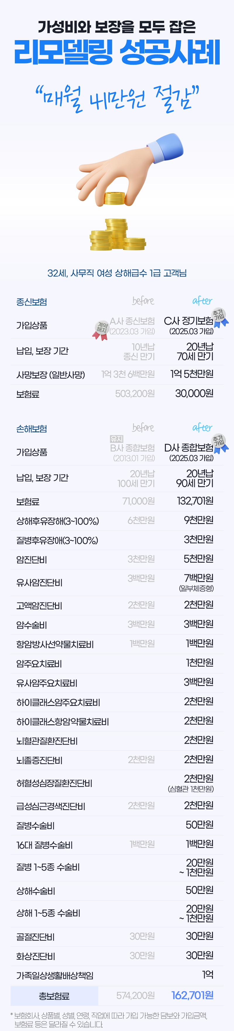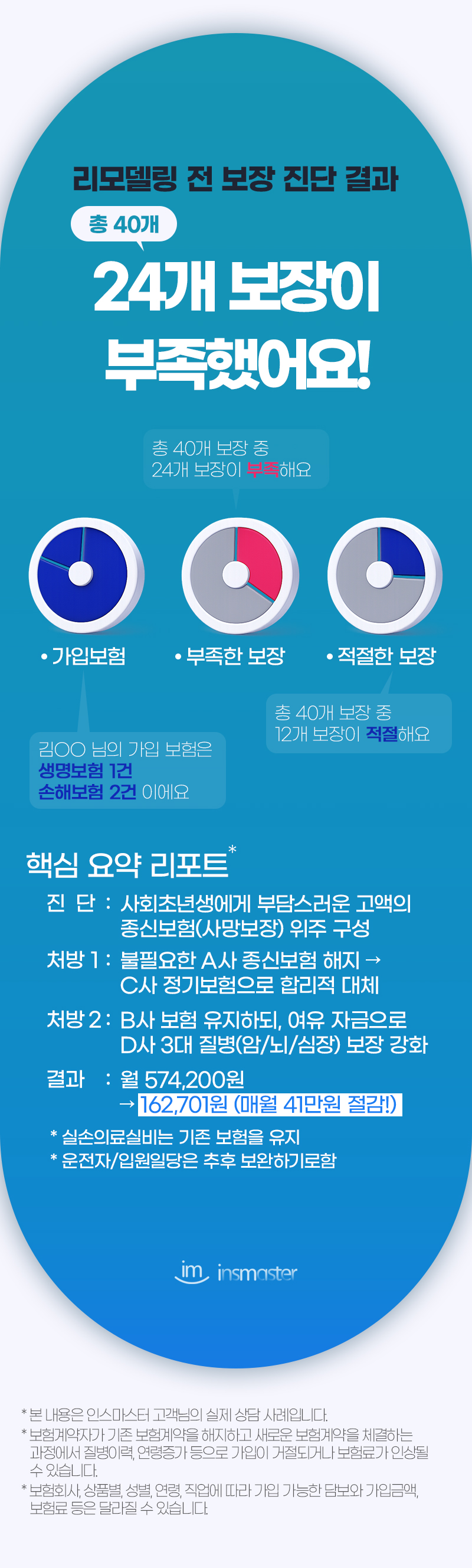 개인정보처리방침 케이지에이에셋(주) 인스마스터지사(이하 “회사”)는 「개인정보 보호법」및 「정보통신망 이용촉진 및 정보보호 등에 관한 법률」등에 관련 법령을 준수하며 보험 상담 및 보험 서비스 제공 등의 업무처리를 위하여 귀하로부터 최소한의 필수정보를 수집합니다. 제공된 모든 개인정보는 별도의 동의가 없는 한 임의의 다른 용도로 사용하지 않습니다. 개인정보 수집 및 이용에 관한 동의 1. 개인정보 수집 및 이용 목적 - 보험 상담, 보험 리모델링 및 가입 권유를 위한 안내 및 서비스 제공 2. 개인정보 수집 및 이용 항목 - 성명, 연령, 연락처 3. 개인정보 보유 및 이용기간 - 동의일로부터 3년 4. 동의를 거부할 권리 및 동의를 거부할 경우의 불이익 - 귀하는 개인정보 수집, 이용에 대한 동의를 거부할 권리가 있습니다. 동의 거부시 보험계약 상담 등의 서비스를 받으실 수 없습니다. 개인정보 제공에 관한 동의 1. 제공 받는 자 - 케이지에이에셋(주) 인스마스터지사 > 인스마스터지사 보험설계사 곽나영 (협회등록번호 : 19951073040006) > 인스마스터지사 보험설계사 권태호 (협회등록번호 : 20071269040029) > 인스마스터지사 보험설계사 금용화 (협회등록번호 : 19940670010065) > 인스마스터지사 보험설계사 김영욱 (협회등록번호 : 20061276020028) > 인스마스터지사 보험설계사 김은희 (협회등록번호 : 20080275030010) > 인스마스터지사 보험설계사 신미선 (협회등록번호 : 19940273090009) > 인스마스터지사 보험설계사 이미현 (협회등록번호 : 20101182110013) > 인스마스터지사 보험설계사 정수경 (협회등록번호 : 20191083080005) > 인스마스터지사 보험설계사 최문기 (협회등록번호 : 20170278020009) > 인스마스터지사 보험설계사 신은미 (협회등록번호 : 20061172040007) > 인스마스터지사 보험설계사 박태규 (협회등록번호 : 20080174020021) > 인스마스터지사 보험설계사 석민지 (협회등록번호 : 20210320002243) > 인스마스터지사 보험설계사 오수빈 (협회등록번호 : 20250820001030) 2. 개인정보를 제공받는 자의 이용 목적 - 보험 상품/서비스 소개 및 상담 - 보험상품판매 및 가입체결 3. 제공하는 정보 - 성명, 생년월일, 연락처, 거주지역 4. 제공받는 자의 개인정보 보유 및 이용 기간 - 동의일로부터 3년 5. 동의를 거부할 권리 및 동의를 거부할 경우의 불이익 - 귀하는 개인정보 제공에 대한 동의를 거부할 권리가 있습니다. 동의 거부시 보험계약 상담 등의 서비스를 받으실 수 없습니다. ※ 동의 철회를 위한 안내 본 동의를 하시더라도 이후에 동의를 철회하거나 가입 권유 목적의 연락에 대한 중단을 요청하실 수 있습니다. 연락처 : 케이지에이에셋(주) 인스마스터지사 김기영 (지점연락처 02-6010-0180 , 휴대폰 010-2236-0345)